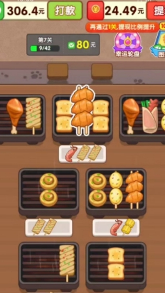 3、每个烤架均有分层设计,烤架下方会预设隐藏其他品类的烤串,待烤架上层的烤串完成消除后,下层隐藏的烤串会自动显现并填充至烤架中。