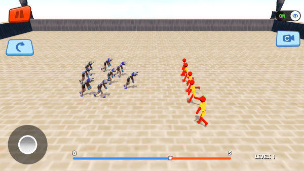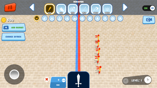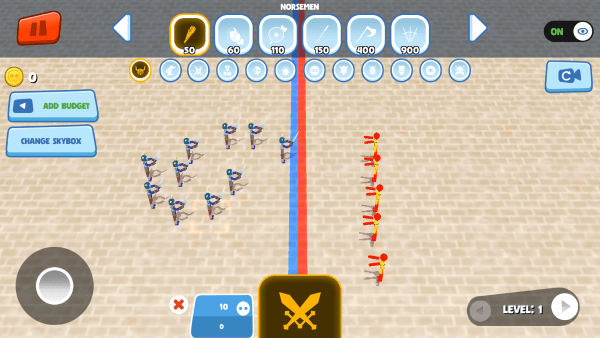 愚蠢战争模拟器这款游戏中分为蓝红两个不同的阵营,你要在这里选择一方加入,然后派出你的士兵去和敌人战斗,首先只能召唤最基础的士兵,随着你的费用点数增加,就能召唤更高级的士兵了,召唤出你的士兵来放置自动战斗,选择上阵具有克制效果的士兵能更快的击败敌人。