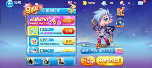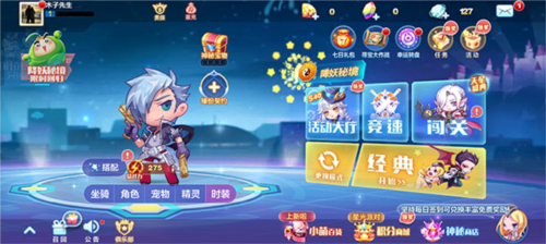 2、开始游戏之前我们要选择坐骑、角色、宠物、精灵、时装,每一种在游戏的时候都有加成,能让玩家获得更高的分数;