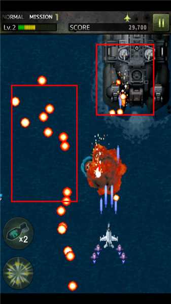 1、进入游戏,滑动屏幕可以移动飞机,左边有两个技能可以使用;