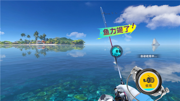4、通过不断以上操作消耗鱼的力气,最终鱼没力即可自动收线。