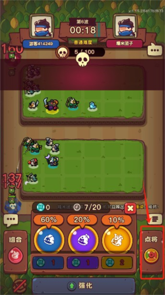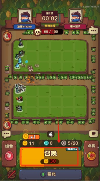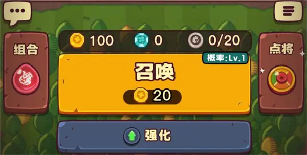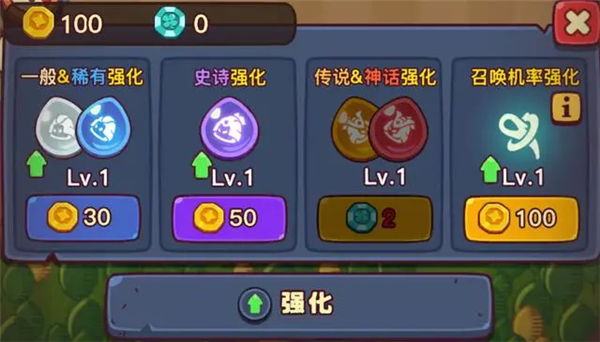 局内可以通过【强化】功能来提升已经上阵角色的基础属性,召唤概率也可以在强化界面中用金币进行强化。