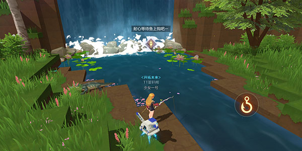 3、这时右手边会出现鱼钩图标,而头顶会出现浮标,此时属于等待状态,当头顶图标变为绿色鱼图标,鱼钩也变为绿色时,可以点击鱼钩进行钓鱼(鱼上钩时需要尽快点击鱼钩,否则鱼会脱钩)。