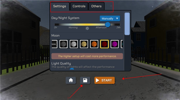 1、进入后会弹出一个设置,可以设置月亮颜色、地图日间夜间的时间等等,点击下面的存储按键保存下来。