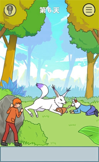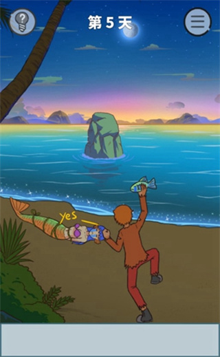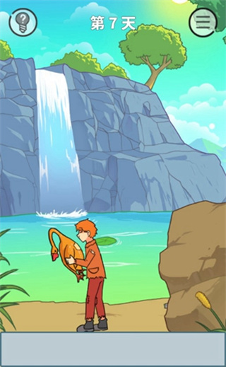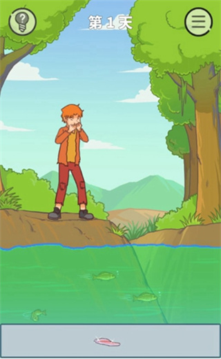 这一关我们需要将这个鱼合理利用起来,手持鱼骨,在河里的那条大鱼朝我们游过来的瞬间,我们拿起鱼骨就往水里砸,就能把那个大鱼砸晕,捞起来吃了。