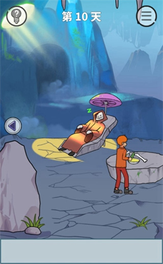 这一关我们进洞拿骨头之前,在山洞外边的草堆上拿到一个锯齿形的草,用这个草去割断骷髅死神和骨头间的线,我们就能顺利拿到骨头了。