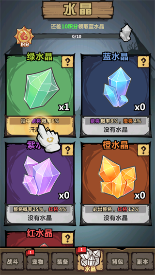 不同颜色水晶对应不同抽卡概率,绿水晶可保底出紫将,橙水晶则必出整将。