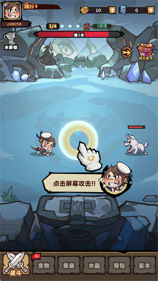 新手引导关卡,提示点击屏幕进行攻击,开启冒险之旅。
