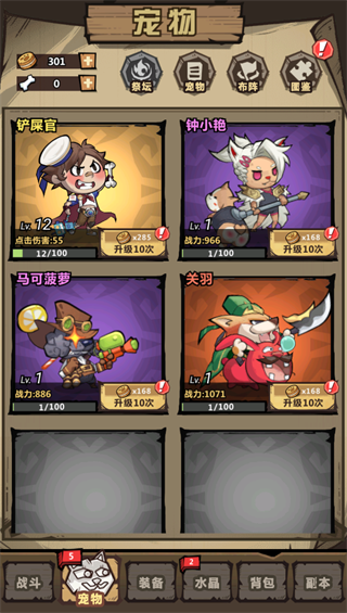 展示已拥有的宠物,可进行升级培养,宠物是提升战力的核心载体。