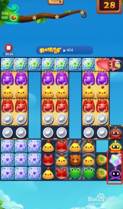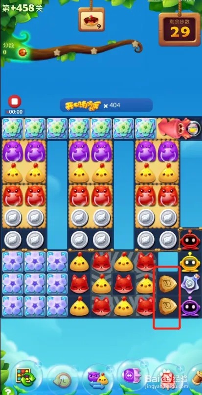 2、第二步合成小黄鸡,这样2个魔力鸟就用掉到一起,这样炸开后,小动物们才能从上面掉下来。
