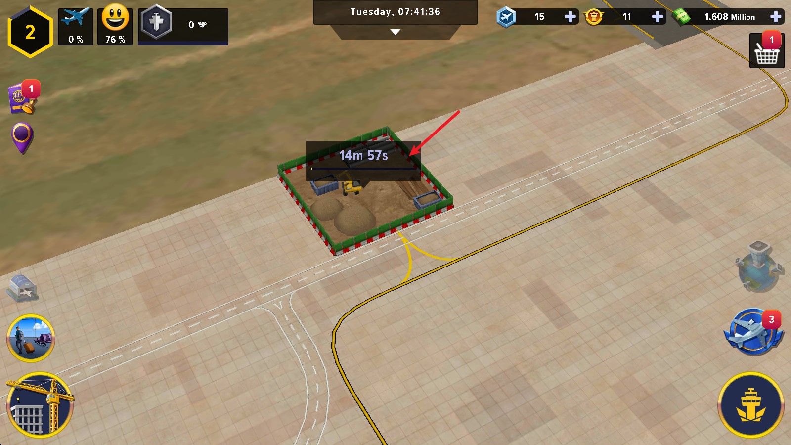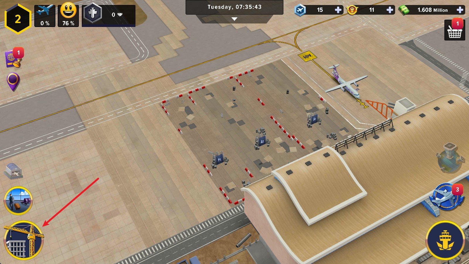1、进入游戏后,点击左下角的建设按钮,可以自由的去建设机场。