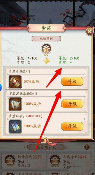 4、选择升级的方式,并点击右侧的升级选项,即可提升门客的资质。