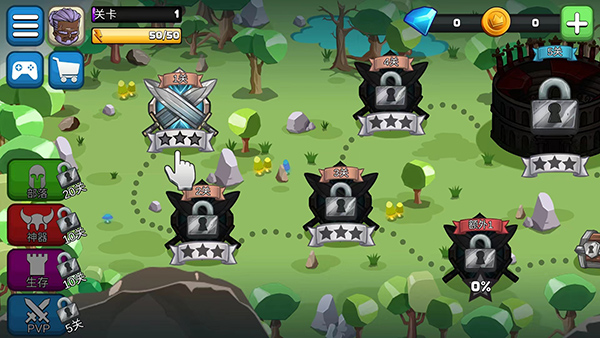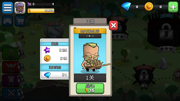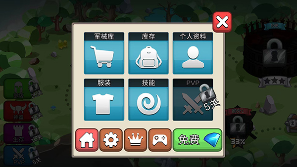 10、在菜单界面,包括军械库、库存、个人资料、服装、技能和PVP等功能选项可以使用,以上就是小小角斗士中文版的游戏玩法了。