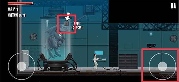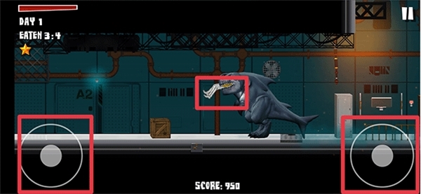 3、左边按钮上滑为跳跃、下滑为蹲下,然后通过左边按钮左右滑动控制鲨鱼前进,并点击右边按钮吃掉途中出现的人类,