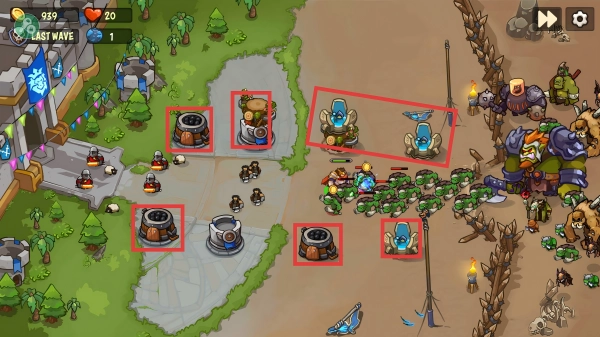 3、在敌人行进路径的关键位置,合理布置各类防御塔,借助它们各自的特性,协同配合来阻击形形色色的来犯敌人。