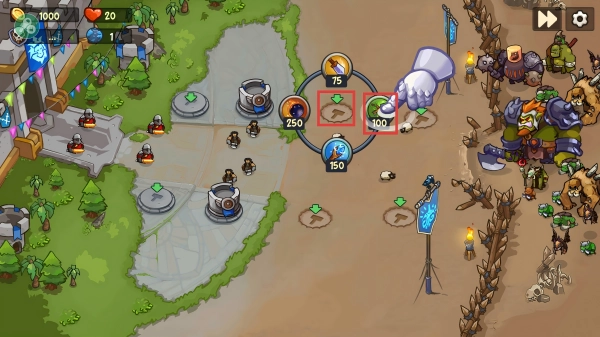 1、战斗开始时,我们根据指引点击消耗100资源来建造防御塔,把它放置到指定的区域,这样就开启了抵御敌人的第一步。