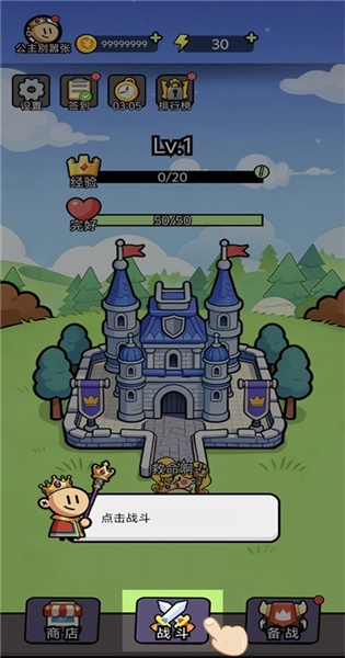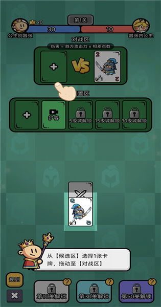1、主题诙谐幽默,打破传统公主等待拯救的固有设定,以“公主强娶国王”这一新颖反差设定为核心,搭配轻松搞笑的剧情对话和Q萌画风,围绕这一主题展开一场充满趣味与惊喜的卡牌对战冒险,每一局对战都能感受到主题带来的欢乐氛围,缓解游玩压力。