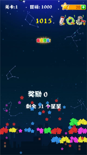 2、画面清新治愈:拥有清新简洁的面板设计、炫酷流畅的消除特效,搭配唯美星空场景,带你沉浸在梦幻的星星消除世界。