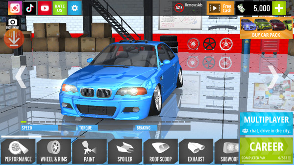 1、进入游戏后会有一辆蓝色汽车等你来装配,我们可以滑动视角观察一下,