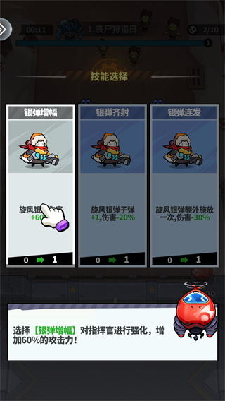 前期优先选择“银弹增幅”技能,可直接提升60%攻击力,大幅增强输出能力,清理小怪,避免被敌人包围。