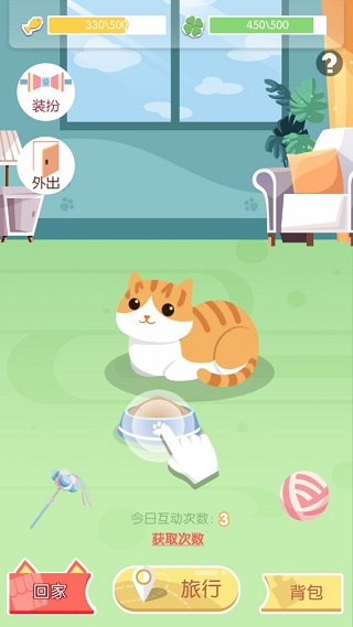7、“回家”后可以撸猫,期间你可以选择外出,让宠物外出游玩,或者消耗钻石、服装碎片来为你的小猫咪打扮,当然记得喂养小猫咪,幸运值越高,猫咪外出游玩时带回来的东西越好哦~