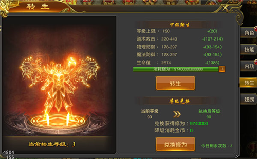 达到90级后可进行转生,转生需要消耗修为值,修为可通过如下方式获得:一是使用修为丹:通过商城购买或活动获得修为丹,使用后增加一定的修为值。二是等级兑换:降低等级,并消耗一定的金币可兑换修为,等级越高兑换的修为值越多,每天最多可兑换3次。三是当拥有一定的修为值时可进行转生,转生后可增加一定的属性。四是转生后还可进入更高级的地图,可穿戴更高级的装备。