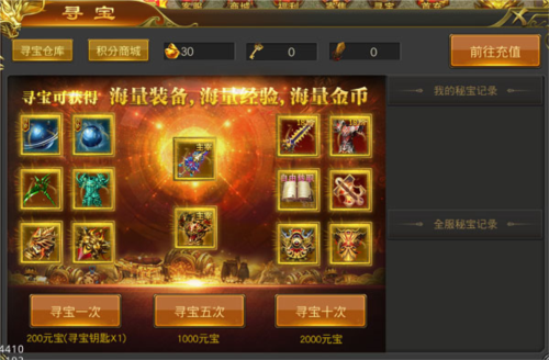 达到72级开启寻宝系统,玩家消耗寻宝钥匙或元宝可进行寻宝。寻宝分1次寻宝、5次寻宝和10次寻宝,寻宝到的物品自动存放到寻宝仓库。寻宝可以获得寻宝积分,寻宝积分可以到积分商城兑换物品。点击寻宝仓库,可以将寻宝得到的物品提取出来。