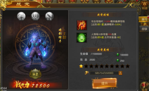 玩家15级即可开启战宠系统,系统开启后玩家可激活战宠并出战,出战的战宠会主动攻击附近的怪物。战宠升级需要消耗一定的金币,战宠等级越高属性越强。装备评分达到一定条件即可激活相应的战宠皮肤,战宠皮肤有高额的属性加成。玩家可以通过购买战宠礼包(麻痹、攻速、真伤)从而提高战宠属性。
