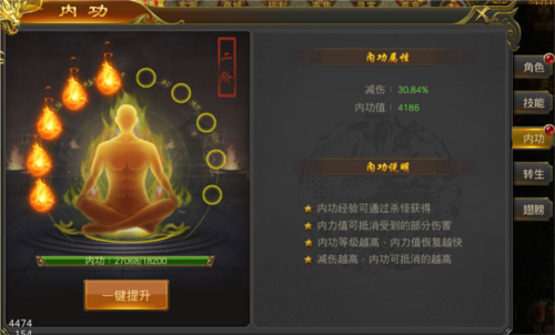 游戏过程中,通过击杀怪物可获得一定的内功经验值。当内功经验值达到一定的值时,玩家可点击一键提升,以提升内功等级。战斗中受到伤害时,系统将根据玩家的内功等级,按减伤的比例优先扣除内力值,内力值为空时,则扣除生命值。玩家内功等级越高,减伤比例和内力值越高,内力值恢复也越快。
