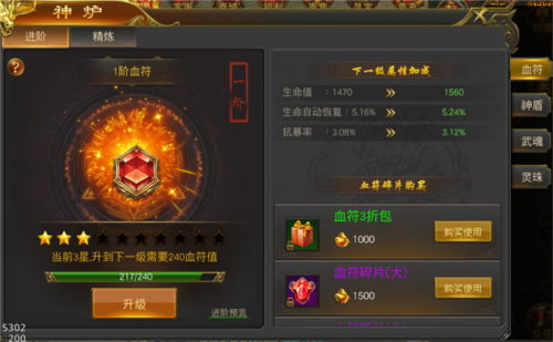 神炉系统分血符,神盾,武魂,灵珠4种装备,分别对应属性生命、防御、攻击、暴击.不同的装备升级所需的资源不同,当资源达到一定值时点击按钮即可升级,升级可增加一定的属性。每个装备每阶分为10星,升满10星后再次升级可升阶,升阶可改变装备形象。神炉材料可通过材料副本、商城、活动获得。