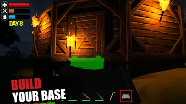 夜晚是最危险的时段,视野受限,丧尸的活动频率反而更高。如果没有安全的据点,很可能在黑暗中迷失方向,或者被四面八方围过来的敌人堵住去路。初期可以选择天然洞穴或者废弃小屋作为临时庇护所,清理掉里面的威胁后,用木板封住门窗。随着进度推进,可以自己动手搭建基地——选址要考虑水源近不近,资源远不远,周围有没有太多丧尸刷新点。基地建成之后,篝火用来取暖和烹饪,储物箱用来囤积物资,工作台用来修理和改进装备。当你忙完一天回到自己亲手搭建的小屋,听着外面的风声和远处的丧尸嘶吼,那种踏实感是游荡者永远体会不到的。