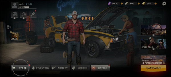打开僵尸国度手游进入车库后,先检查弹药、金币和钻石储备,优先用初始资源升级手枪,提升基础伤害。