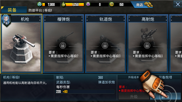 4、选择你想要的装备机械买入机枪、榴弹炮、轨道炮等等,我们等级还不够,所以点击机枪,点击装备即可;