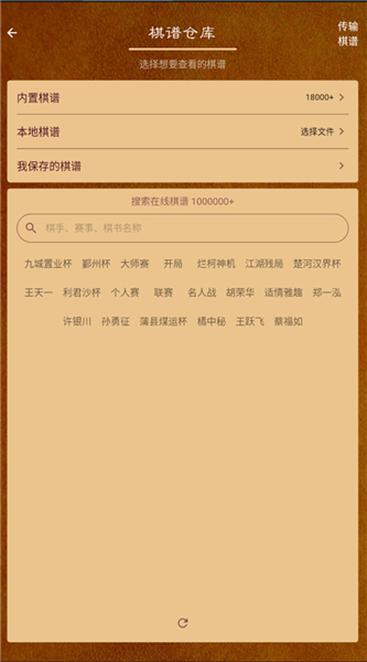 该模式中我们可以查看选择不同的棋谱,同时也支持本地导入棋谱,当然你也可以在线搜索棋手、赛事、棋读;