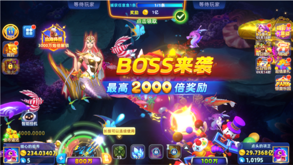 2、丰富多变的花样鱼阵自由切换,万倍超强 BOSS 震撼登场,完美还原经典街机捕鱼氛围,给你身临其境的畅爽感受!
