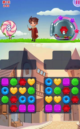 6、把4颗糖果连在一起会形成强力的魔法特效,启动它会消除直线上的所有糖果,