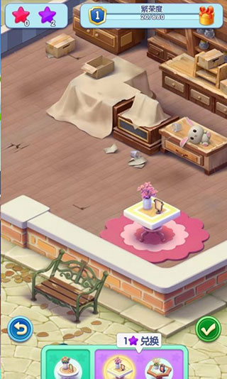 2、下面开始修复奶茶店,先摆放些新茶几,点击任务,开始重建集市,摆放茶几需要消耗1颗红星,