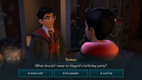 玩家需要在游戏中做出各种选择。例如,玩家从三个选项中做出的选择会决定他们能拿到什么样的魔杖,决定他们与其他角色之间的友谊有多么深厚,或者决定解决问题的方法,从而影响未来发生的剧情。他们可以选择获得何种奖励,从而提升玩家的勇气、同理心以及学识。通过完成剧情或者参加课程可以获得奖励。而有些选项只有在玩家的勇气、同理心或者学识足够高时才可以做出。