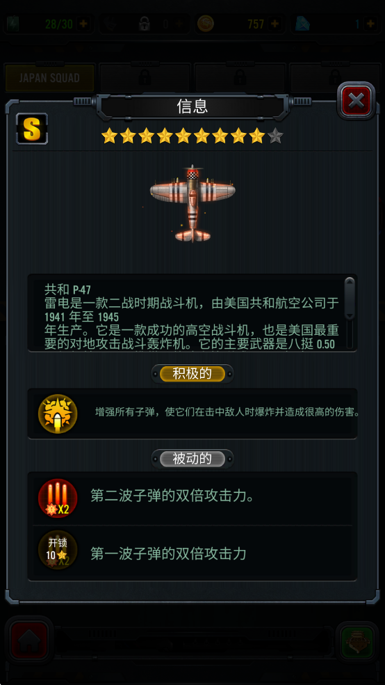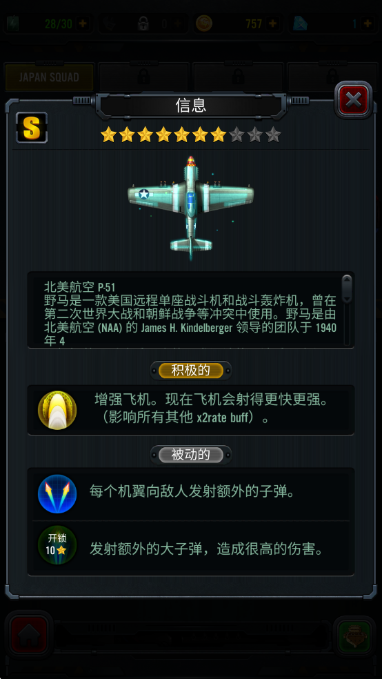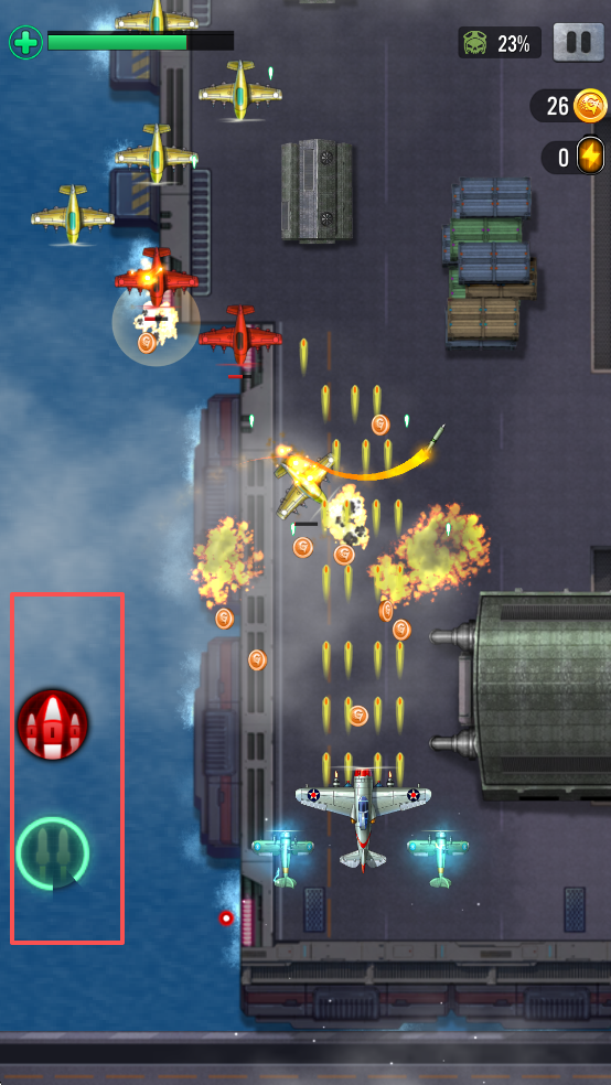 主动技能:增强飞机,现在飞机会射得更快更强。