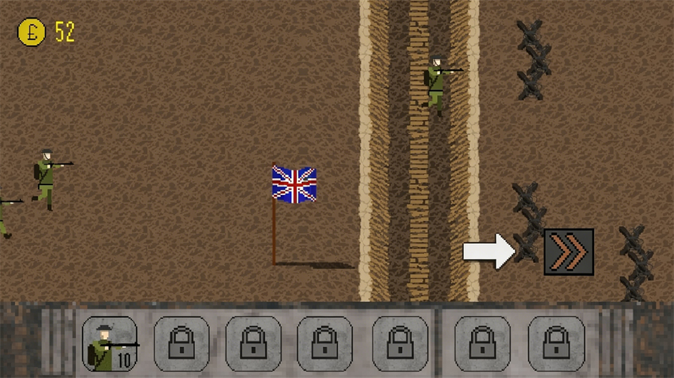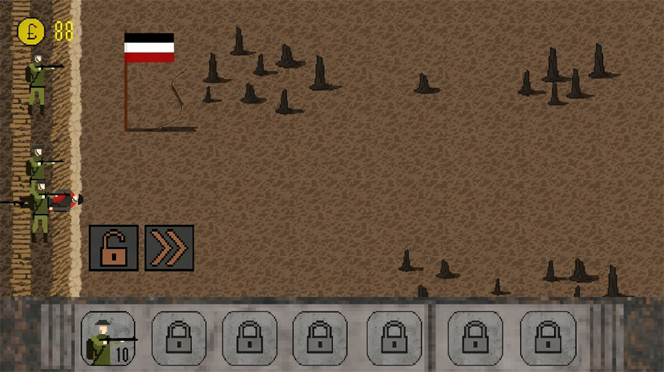 1、 复古像素:独特的像素艺术风格呈现一战场景,既保留怀旧质感又细腻刻画了战场细节与动态效果。