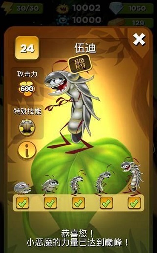 特殊技能:黄色甲壳虫,最开始的时候每回合可以将1个方块变成黄色,等到把小怪物升级到最高等级之后每回合都可以将5个方块变成黄色。