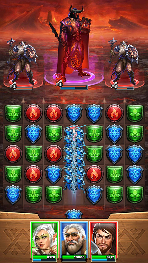 2、 技能释放:消除特定颜色宝石可为对应属性的英雄积攒能量,能量满后即可手动释放威力巨大的专属主动技能。