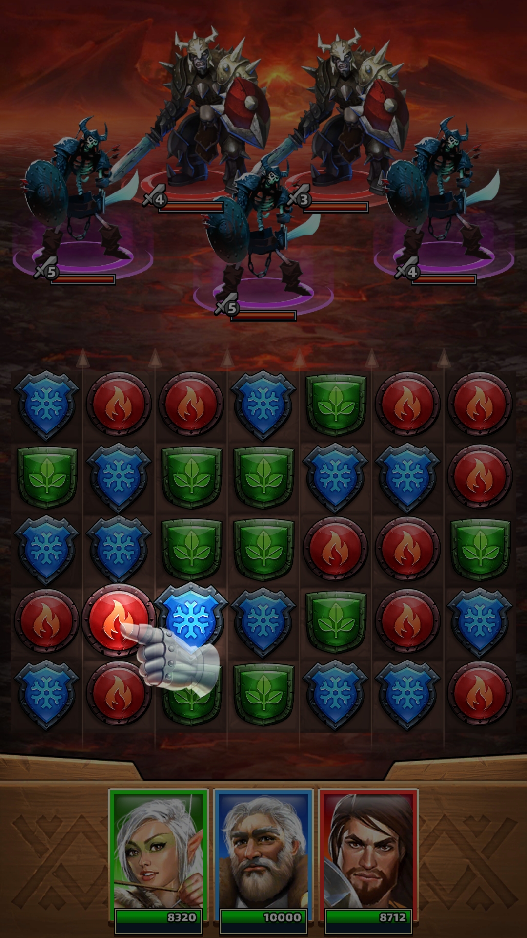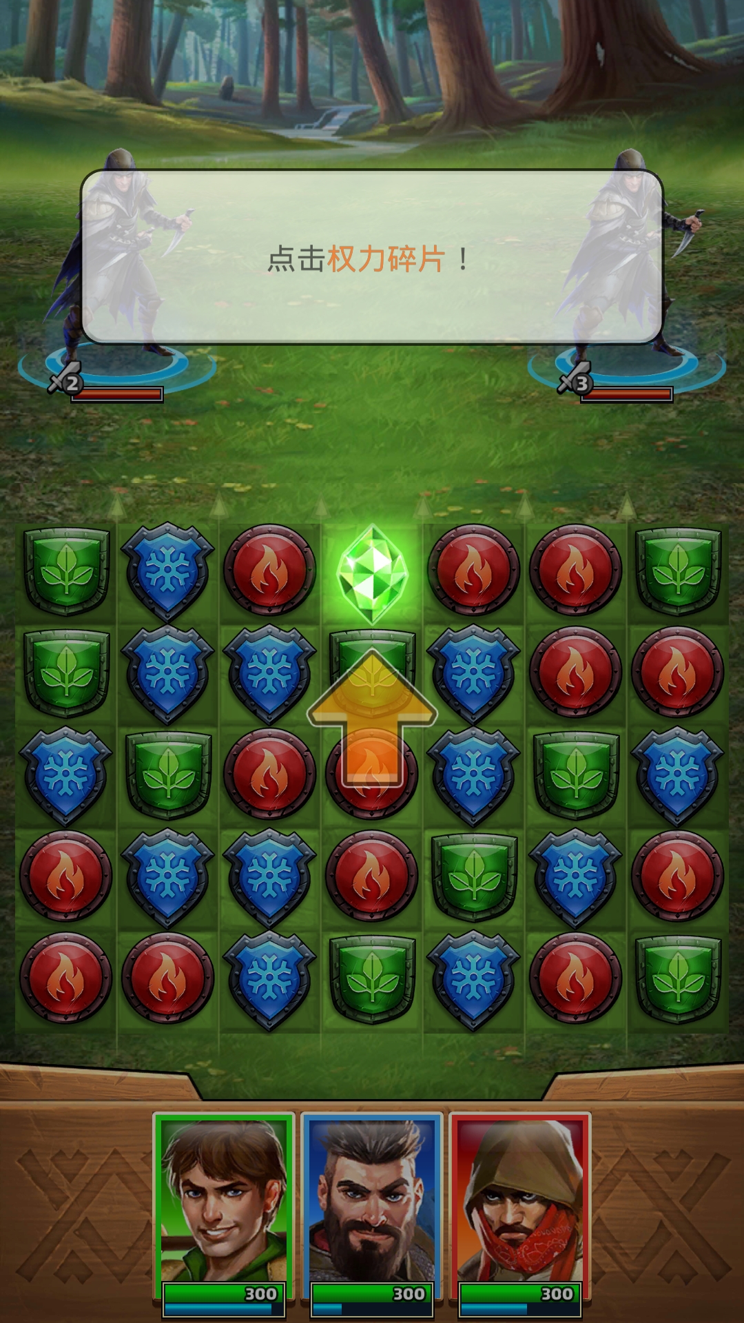 1、 三消战斗:核心玩法为匹配消除,玩家通过交换同色宝石触发攻击,消除数量越多,对对应位置敌人的伤害越高。