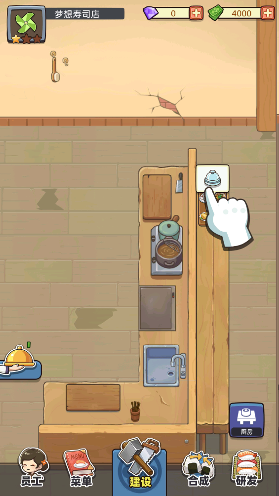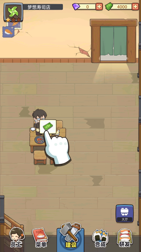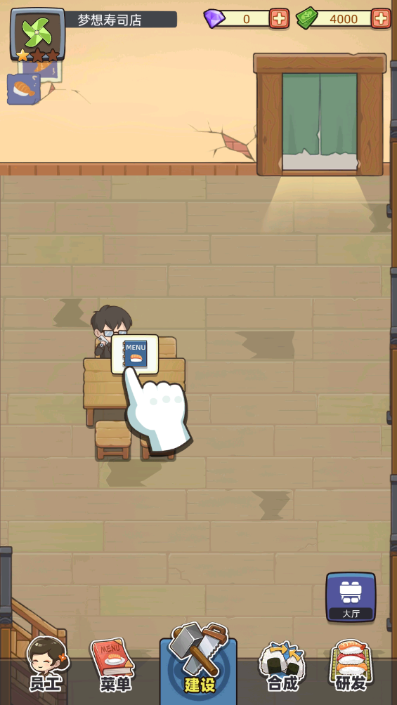1、首先在本站下载安装好后,打开游戏,在这里,玩家需要与小野凉太共同经营一家寿司店,我们需要把店铺清扫并让它运作起来,清扫好之后需要去购置桌椅以及厨房的设施,点击【建设】;