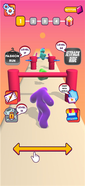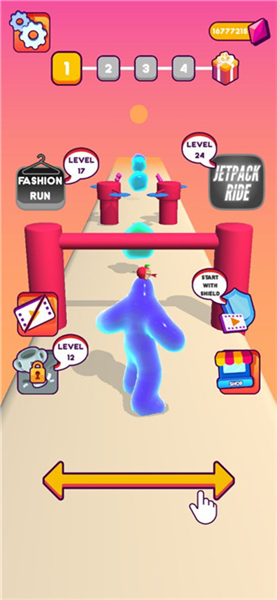 3、成长与奖励挂钩:小心躲避各类障碍物,不断收集果冻让果冻人长大,终点奖励的多少直接取决于果冻人的最终大小。
