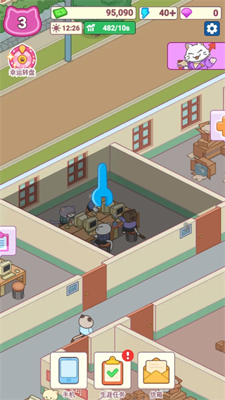 1、 员工招募:在猫咪招聘站雇佣不同品种的猫员工,它们拥有各自专长,自动在工地或办公室进行生产作业。