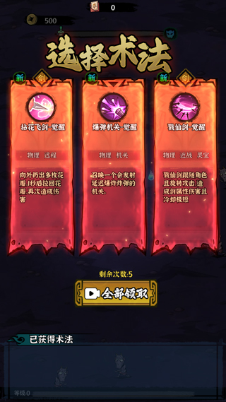 4、敌人死亡后会掉落经验,拾取后可提升等级,每次升级可选取一项术法;