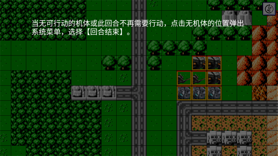 4、当无可行动的机体或此回合不再需要行动,点击无机体的位置弹出系统菜单,选择【回合结束】。