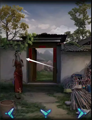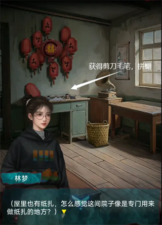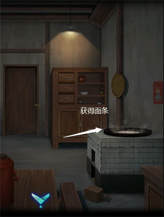 7、在厨房点击面获得一碗面条,去到有灯笼的那个房间,点击桌上纸房子的门,获得纸条提示;