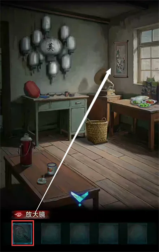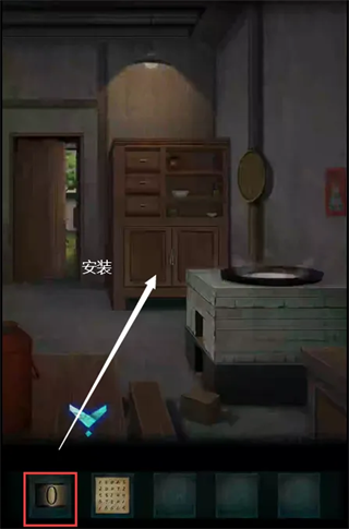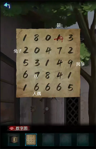 9、使用铁架在厨房风箱处获得白色圆石头,使用铁铲在大门口紫花处获得放大镜,使用放大镜在有灯笼的房间内的画上可看见五个字符,且每个字符对应不同的图案,根据字符对应点击放拨浪鼓的盒子,获得拨浪鼓。